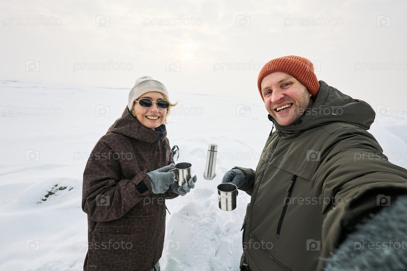 Портрет белокожей пары среднего возраста, улыбающейся во время выпивки на свежем воздухе