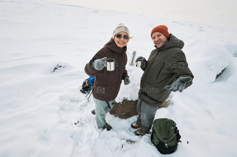 Кавказская пара средних лет улыбается, выпивая горячий напиток на свежем воздухе
