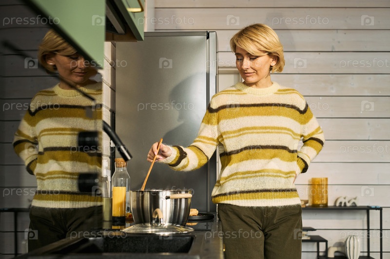 Кавказская женщина средних лет готовит суп на современной кухне улыбаясь