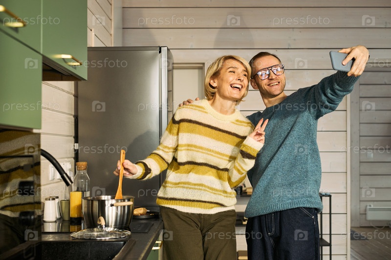 Белая женщина средних лет и взрослый белый мужчина фотографируются с улыбкой