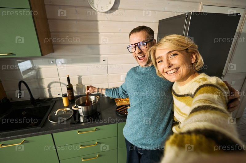 Портрет белокожей пары средних лет, улыбающейся и готовящей вместе на кухне