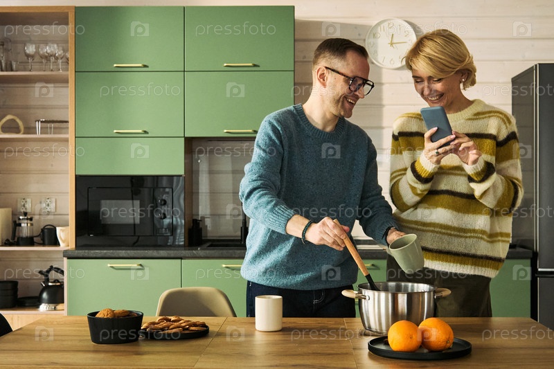 Кавказский взрослый мужчина готовит еду, в то время как женщина использует смартфон