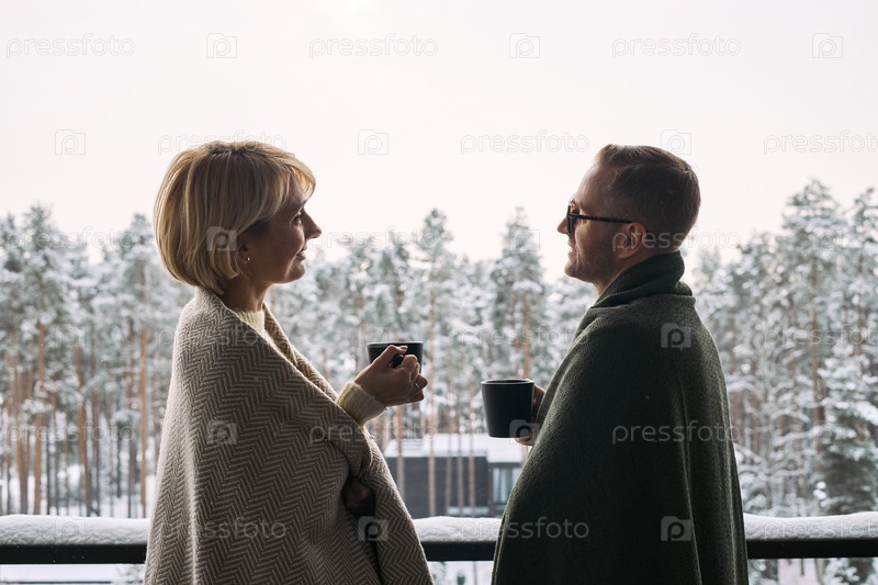 Кавказская женщина и мужчина пьют кофе на открытом воздухе в зимнем лесу
