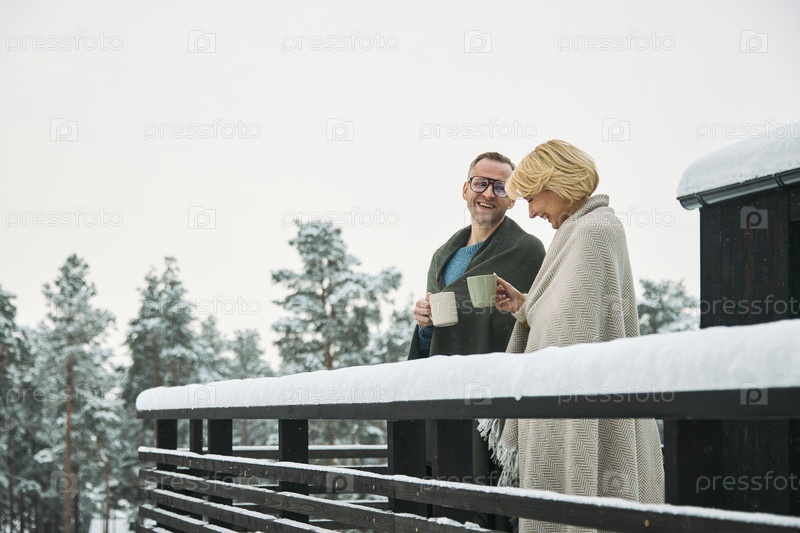 Кавказская пара средних лет наслаждается горячими напитками вместе на снежном балконе