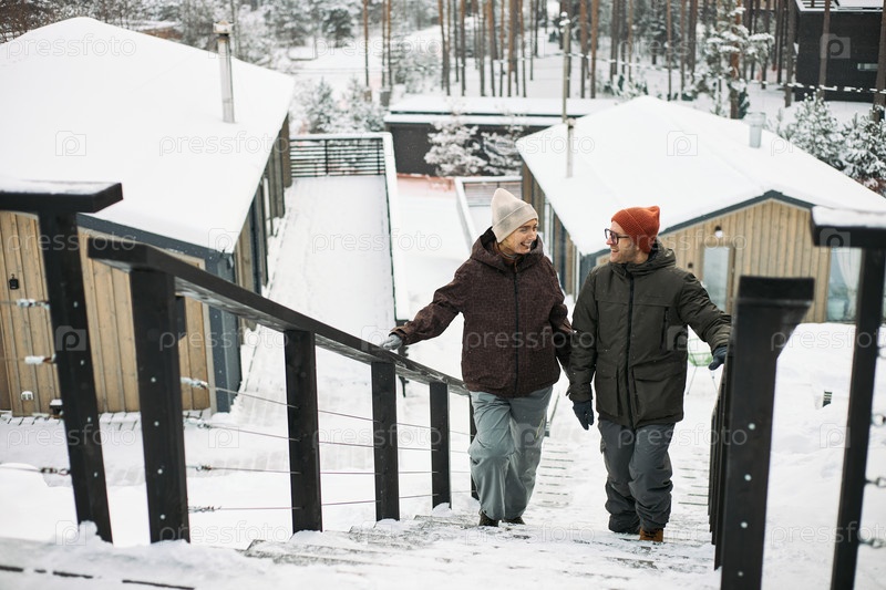Белая женщина средних лет и взрослый мужчина поднимаются по снежным лестницам на открытом воздухе
