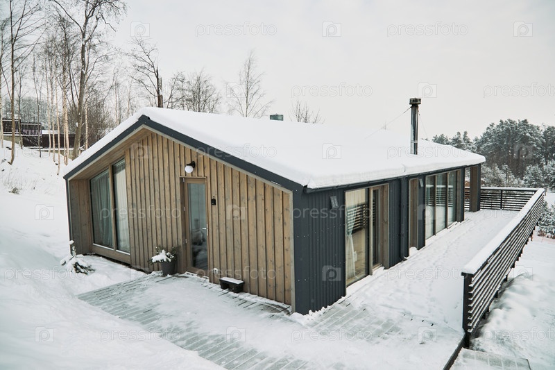 Деревянный дом, покрытый снегом, в окружении современного ландшафта зимнего леса