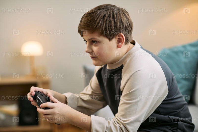 Одиннадцатилетний мальчик играет в видеоигру с сосредоточенным выражением внутри помещений Pr