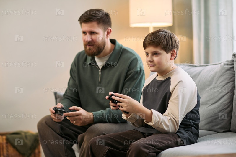 Мужчина и мальчик сидят на диване, играя в видеоигры вместе