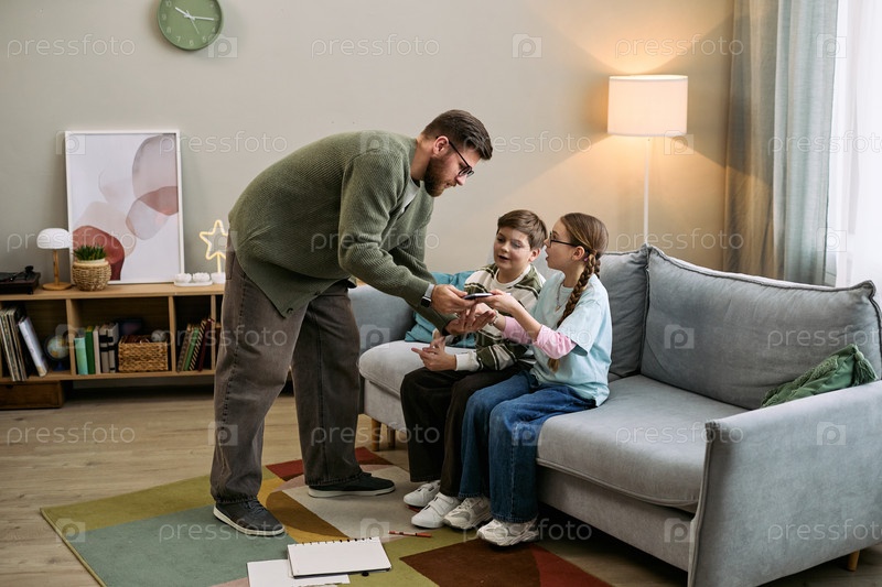 Мужчина средних лет помогает двум детям с помощью смартфона на диване