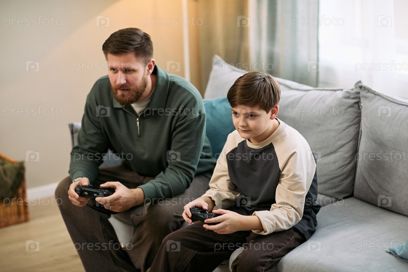 Мужчина среднего возраста и мальчик играют в видеоигры вместе в помещении