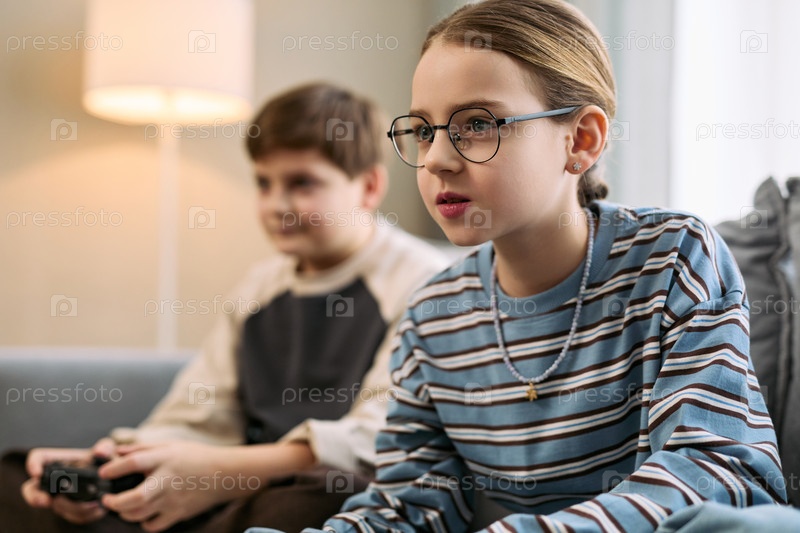 Девочка-подросток сосредотачивается, играя в видеоигру с подругой