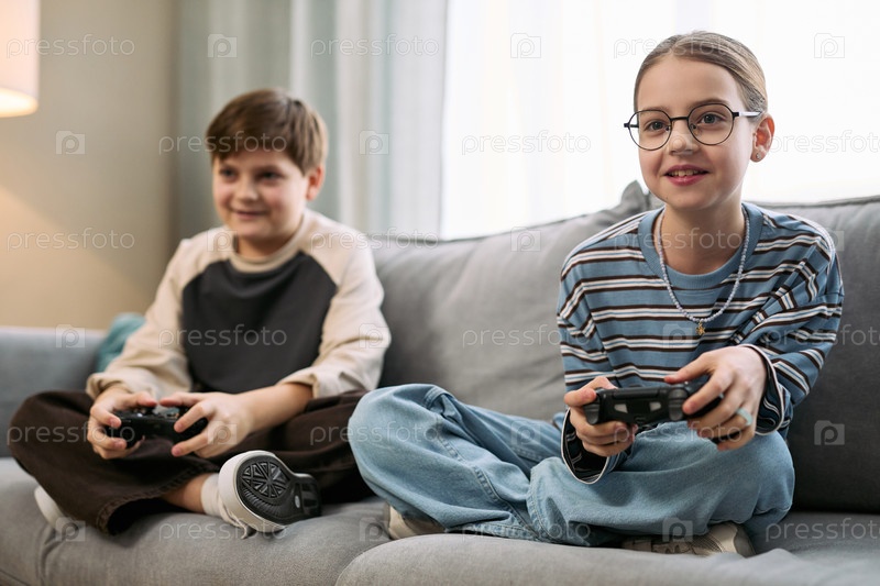 Мальчик и девочка играют в видеоигры вместе на диване