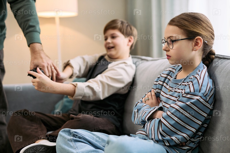 Хватается за пульт управления, пока девушка сидит расстроенный мальчик