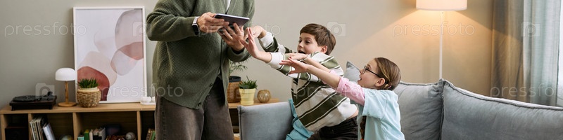 Мужчина средних лет показывает планшет возбужденным детям в гостиной