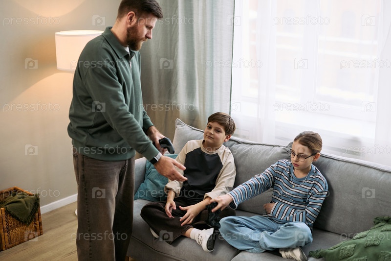 Мужчина дарит смартфон двум сидящим в помещении детям