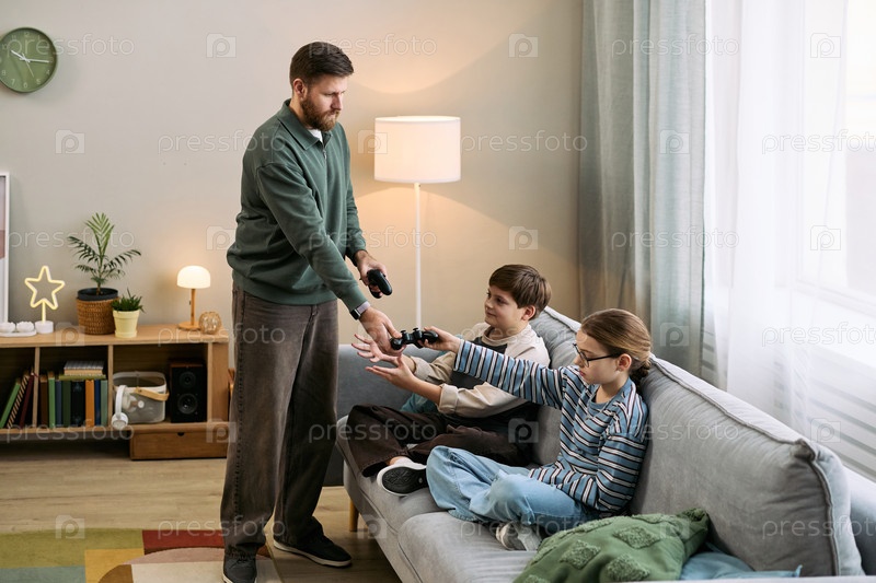 Отец передает игровые контроллеры двум детям, сидящим на диване