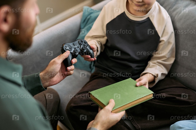 Мужчина, обменивающийся контроллером видеоигры с ребенком, держащим книгу