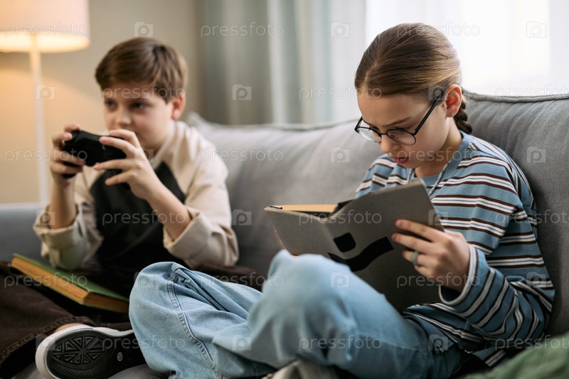 Мальчик играет в видеоигры, пока девочка читает книгу внутри дома