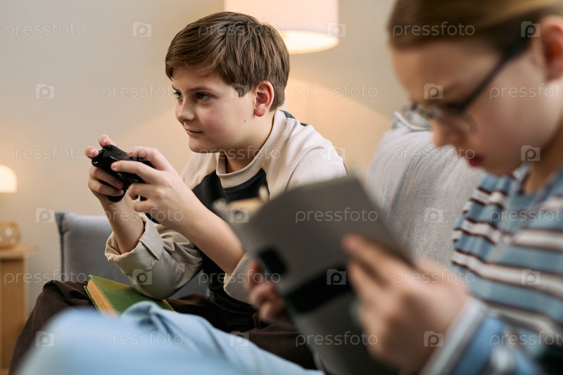 Мальчик играет в видеоигры, пока девочка использует цифровые планшеты внутри дома