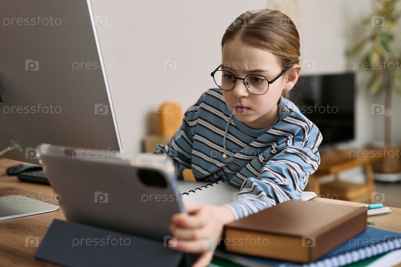 Девочка-ребенок использует планшетный компьютер во время учебы за столом в помещении