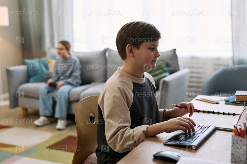 Мальчик-подросток, использующий компьютерную клавиатуру во время учебы дома