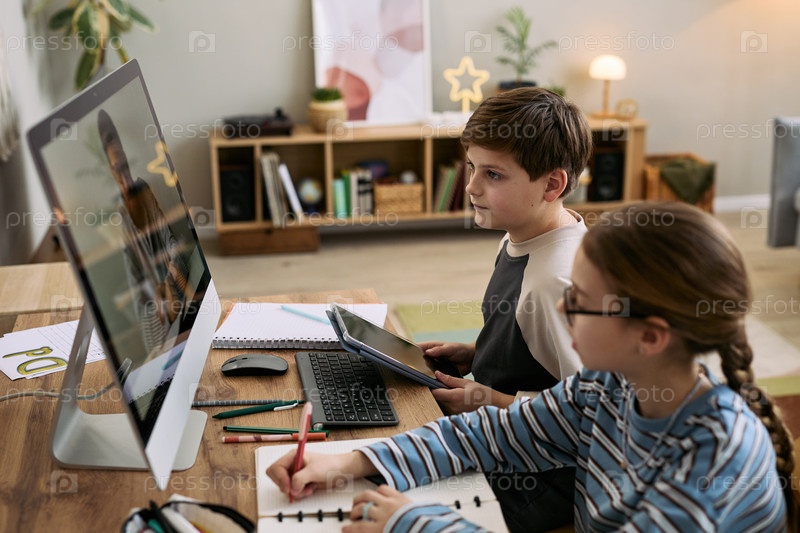 Мальчик и девочка учатся вместе с помощью компьютера и планшета дома