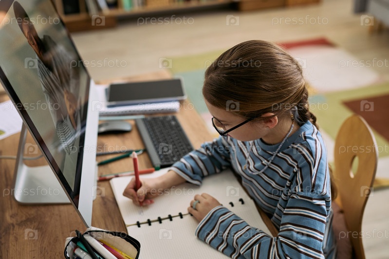 Девочка-ребенок учится онлайн и пишет заметки во время виртуального урока