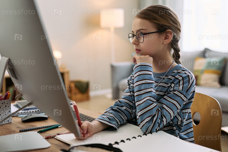 Девочка-ребенок использует настольный компьютер во время учебы дома