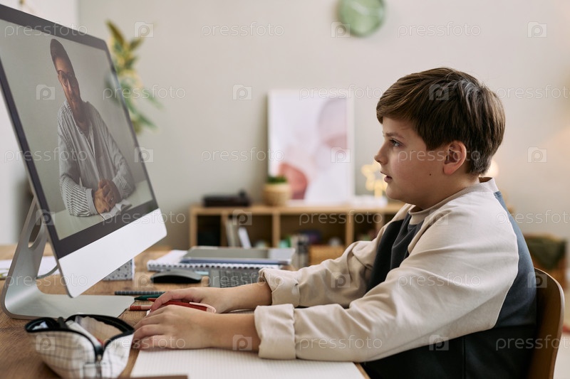 Мальчик посещает онлайн-класс с учителем на мониторе компьютера