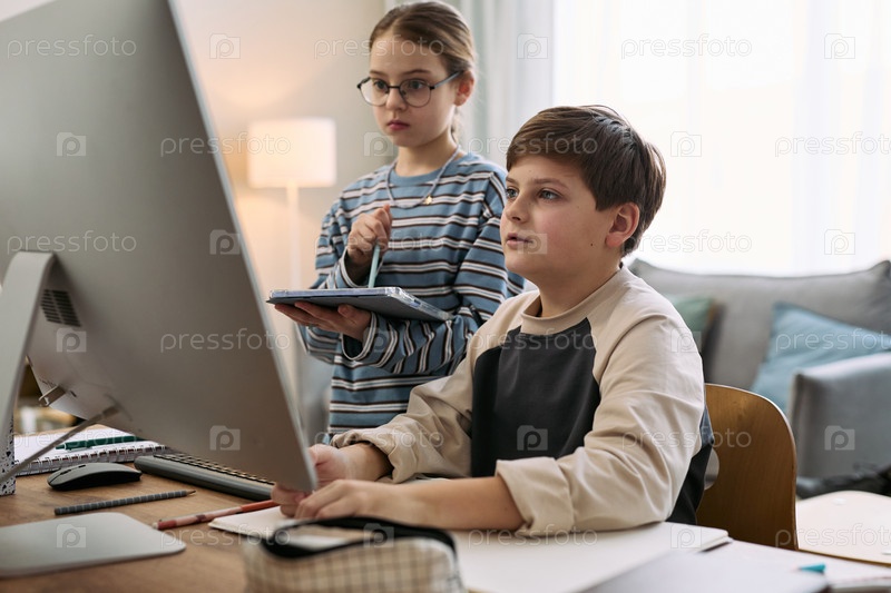 Мальчик использует настольный компьютер, в то время как девушка держит цифровой планшет