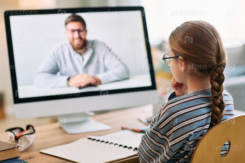 Девочка смотрит онлайн-уроки с мужчиной среднего возраста на компьютере