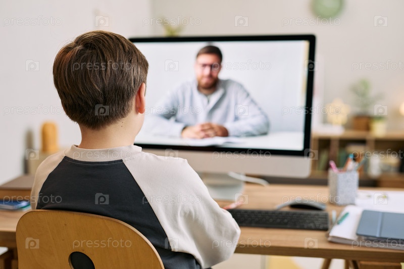 Мальчик посещает онлайн-уроки с молодым взрослым мужчиной учителем на компьютере