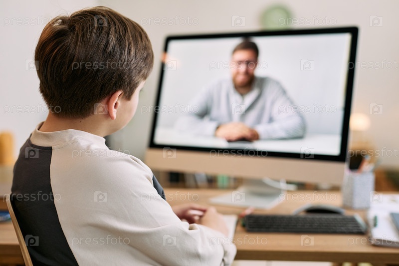 Мальчик, посещающий онлайн-встречу с мужчиной среднего возраста на экране компьютера