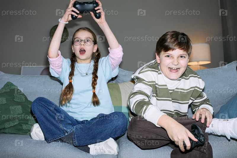Девочка и мальчик играют в видеоигры и выражают волнение