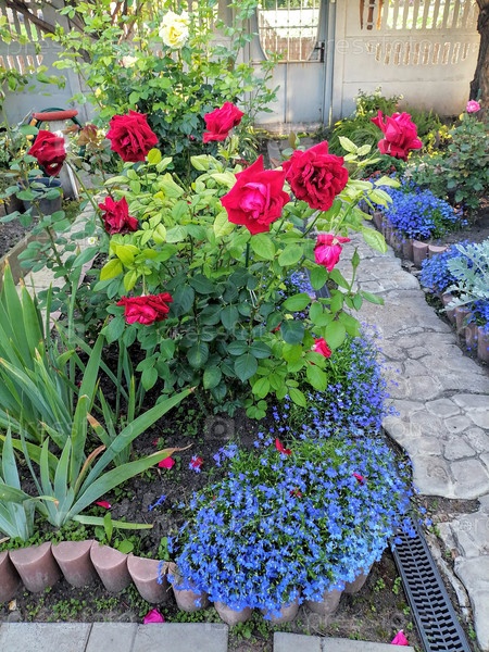 Куст роз с красными цветами на клумбе