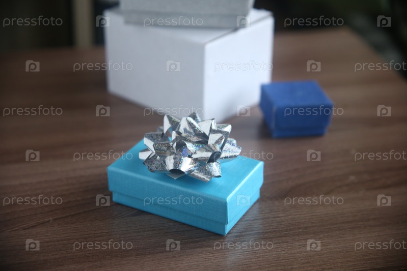 Сюрприз в подарочной голубой коробке с бантиком, крупный план