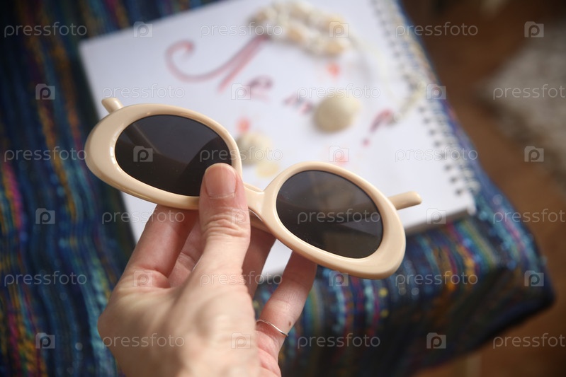 Рука человека держит солнцезащитные очки в белом покрытии на фоне слова "лето", крупный план
