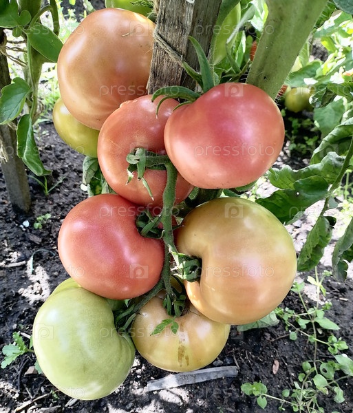 Зеленые и бурые помидоры на кусте с каплями дождя