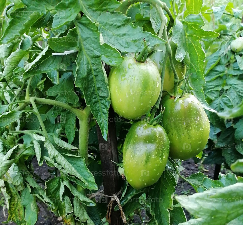 Зеленые помидоры на кусте с каплями дождя