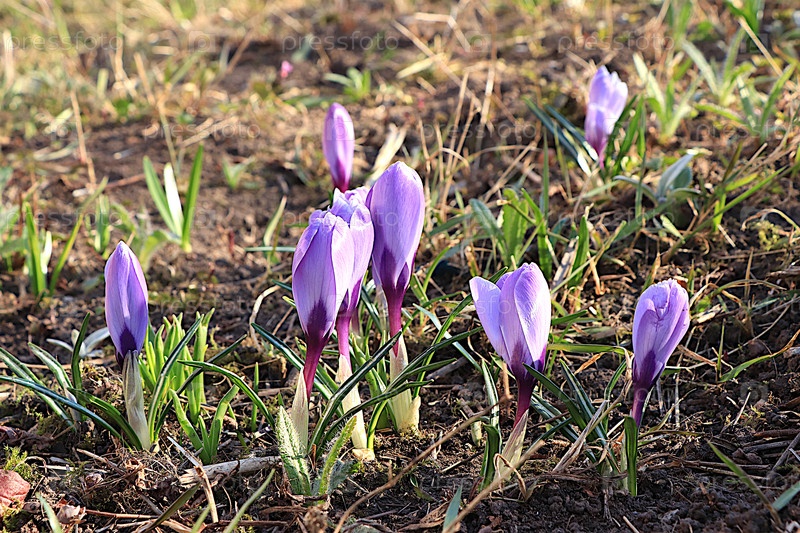 Нежные первые побеги крокусов с каплями росы после дождя в весеннем саду.Абстрактный цветочный фон с размытым фоном с боке.Концепция прихода весны,