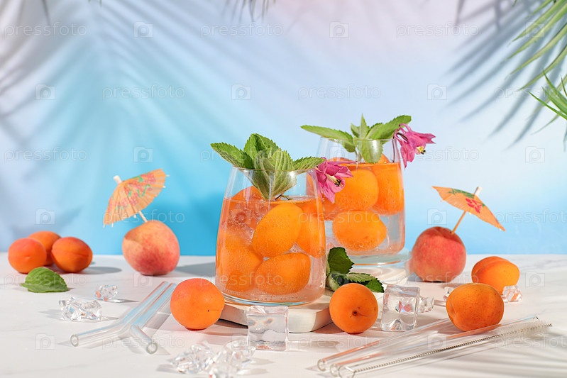 Замороженный персиковый чай или коктейль с мятой и абрикосами, освежающий рецепт летнего напитка.Два стакана лимонада из персикового фрукта на легком столе, детоксикационная диета и концепция похудения, меню ресторана