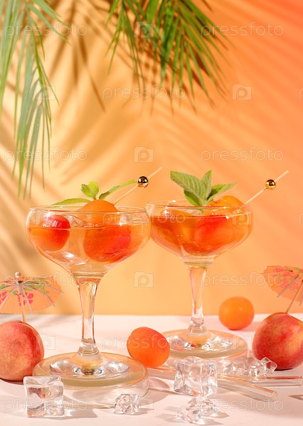 Современный натюрморт с алкогольным коктейлем или пуншем, персиком, абрикосом и мятными ягодами на элегантном фоне, минималистическая концепция для бара и праздничной вечеринки, кафе, рекламного баннера