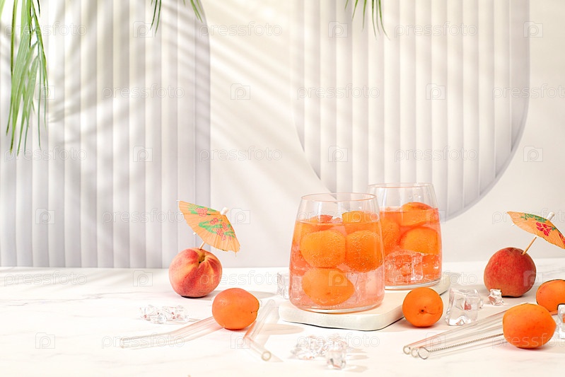Замороженный персиковый чай или коктейль с мятой и абрикосами, освежающий рецепт летнего напитка.Два стакана лимонада из персикового фрукта на легком столе, детоксикационная диета и концепция похудения, меню ресторана