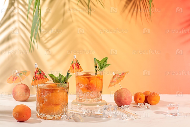 Холодный домашний лимонад, сок или коктейль с мятой, абрикосами, персиками и цитрусовыми фруктами, детоксикационная диета и концепция похудения, меню ресторана, выборочный подход