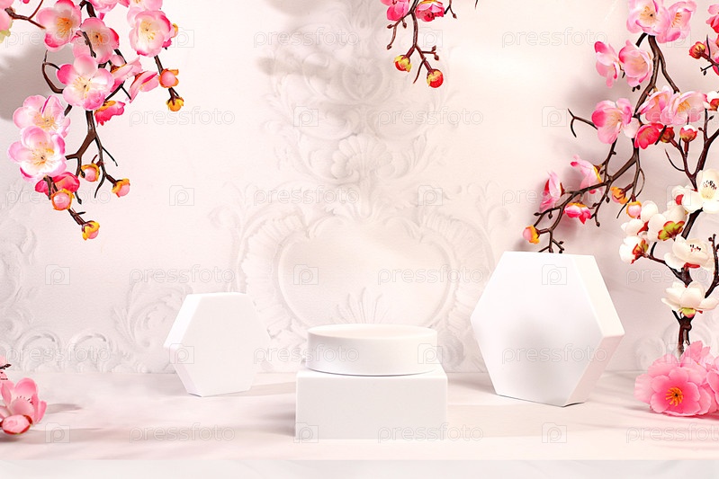 Красивый весенний стенд и шаблон для вашего творчества на красочном фоне с розовыми цветами сакуры для дизайна, Абстрактная композиция для отображения косметических продуктов, Элегантная концепция красоты