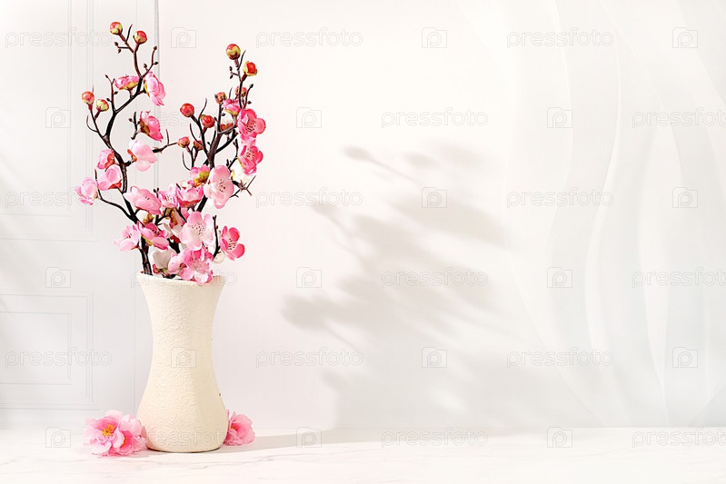 Абстрактная весенняя цветочная аранжировка с ветвями вишни в вазе, элегантная концепция красоты, сцена для демонстрации продукта и бизнес-концепция.Минимальная современная эстетика