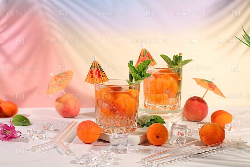 Холодный домашний лимонад, сок или коктейль с мятой, абрикосами, персиками и цитрусовыми фруктами, детоксикационная диета и концепция похудения, меню ресторана, выборочный подход