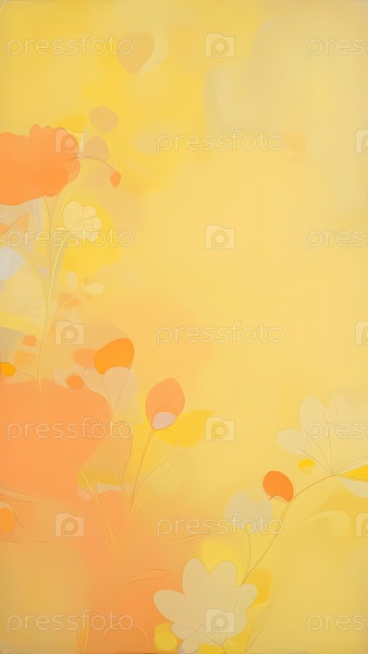 Различные цветы в желтом и оранжевом цветах расположены на ярком фоне.Дизайн показывает мягкие листочки и листья, смешивающиеся с красками весеннего Generative AI