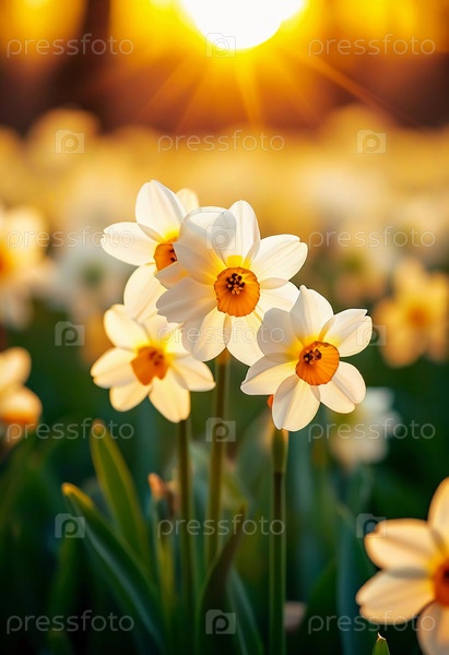 Цветы нарцисса стоят высоко в клумбе, а солнце садится на заднем плане. Яркие цветы создают яркую сцену по мере приближения вечера Generative AI