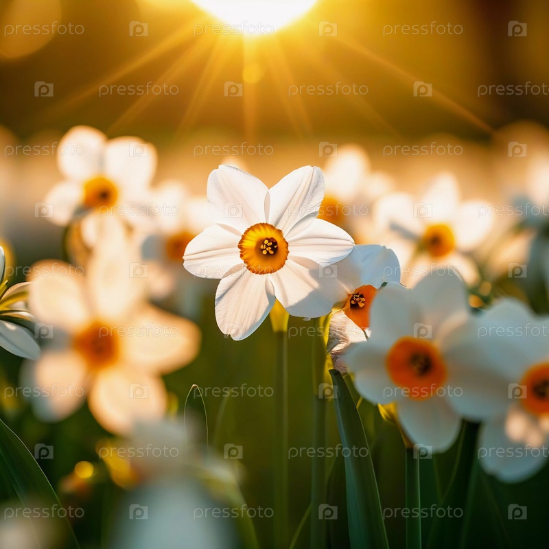 Цветы нарцисса растут в клумбе утром.Солнечный свет проникает через листья, создавая теплое свечение.Сцена заполнена белыми цветами Generative AI
